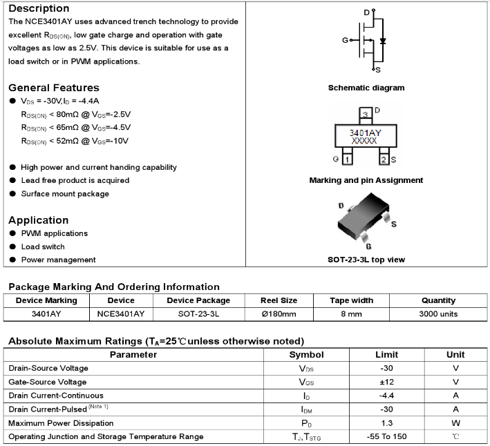 锂电池保护板一般选用30VMOS管,在这里给大家介绍下新洁能的增强型P沟道MOS管:NCE3401AY那么为何选用新洁能的NCE3401AY呢?南山电子给大家分享下NCE3401AY的规格书,顺带给大家解答: