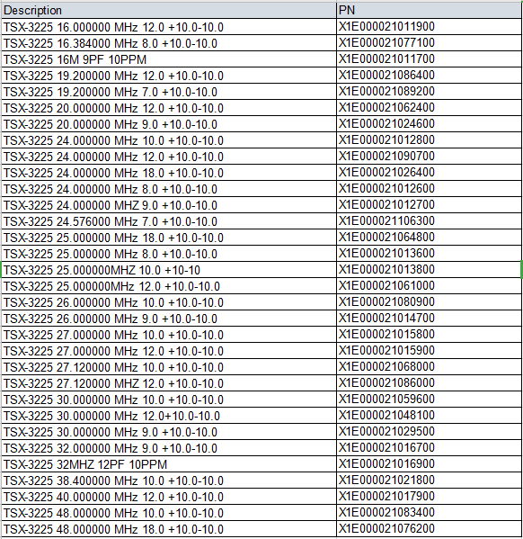 今天给大家介绍适用于便携式无线传输设备的3225无源那么就不得不提下TSX-3225ESPON的TSX-3225产品已经非常成熟,已经在各个产品各种应用环境中都有成熟的应用,业内人都知道,虽然爱普生已经开发出2520甚至更小尺寸2016无源晶振,但是尺寸更小,也代表着制造工艺越发繁琐成本的增高,现在很多便携式产品需要尺寸小,高性能,寿命长,价格适中的,3225已经相对而言属于小尺寸晶振,可以满足便携式设备的要求,价格也比2520,2016要低,厉害的是,TSX-3225无源晶振的成本比5032的也低,所以说TSX-3225是性价比较高的的选择。TSX-3225常用的型号中TSX-3225 24MHz 12PF±10PPMTSX-3225 16MHz 12PF 10PPM都是比较常用的两颗料工作温度:-40℃ ~ +85℃。TSX-3225系列无源晶振是一款应用比较广泛的爱普生无源晶振。因为其频率范围覆盖16MHz~48MHz。可以用于移动电话,蓝牙,无线-局域网,ISM 频段电台广播,MPU时钟等领域。下面南山电子就把TSX-3225的常用的标准频率表分享给大家